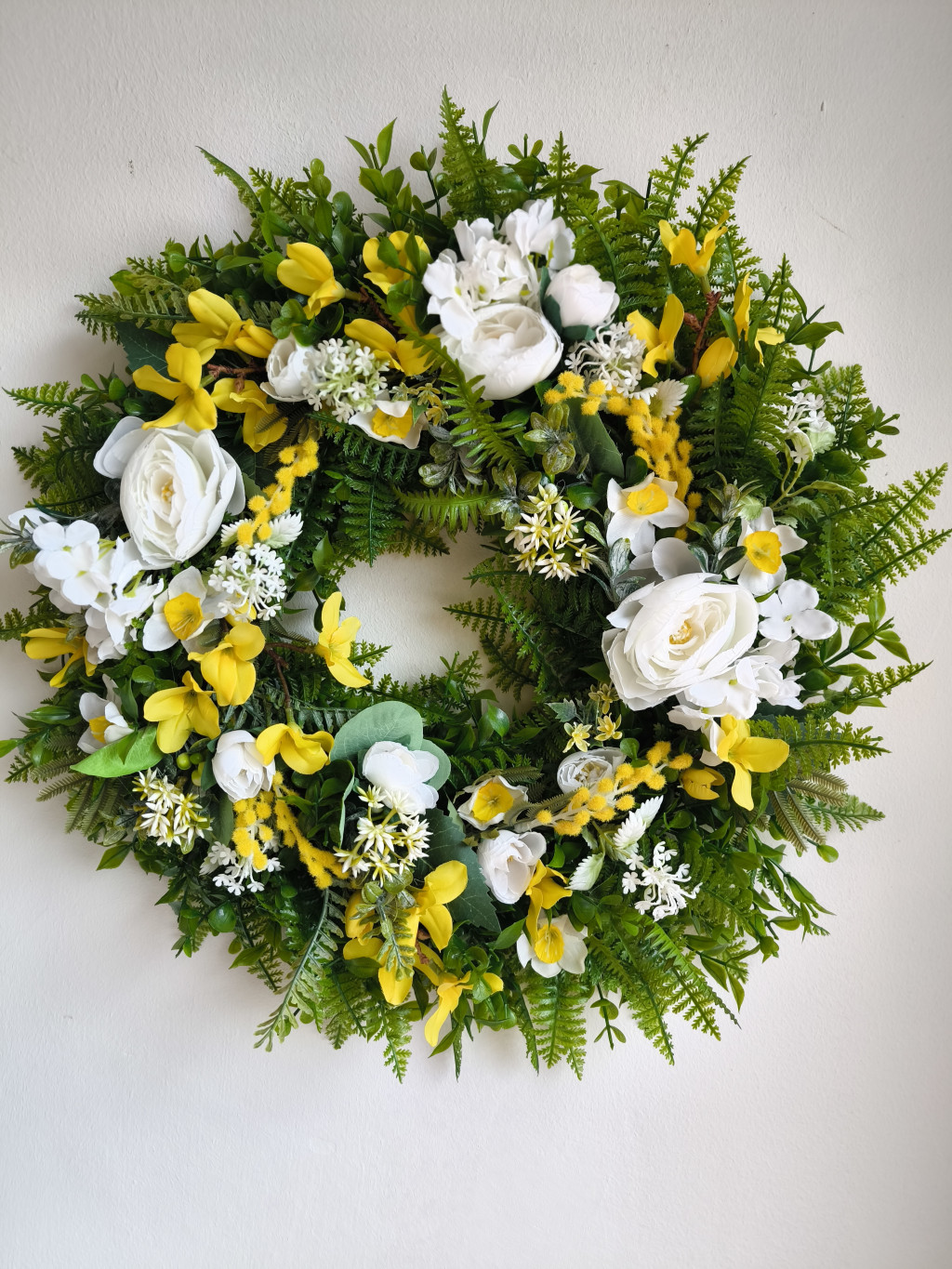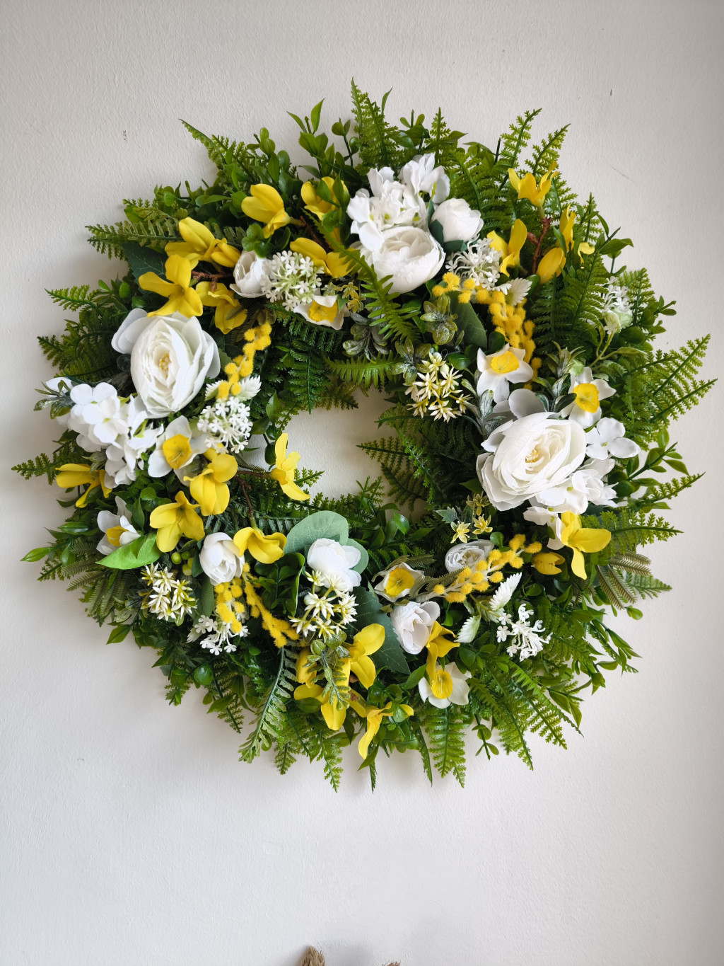 Maradandó ajtódísz, mimozával. nárcisszal, boglárkával.