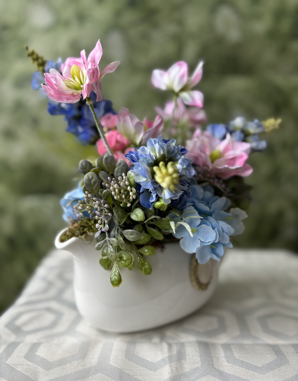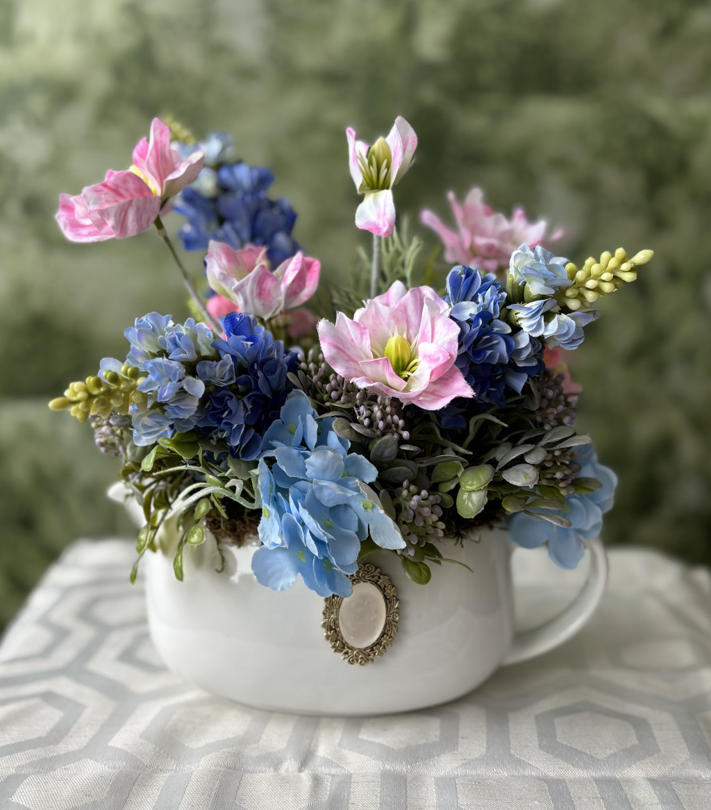 Élethű művirágokkal díszített kerámia kancsó.