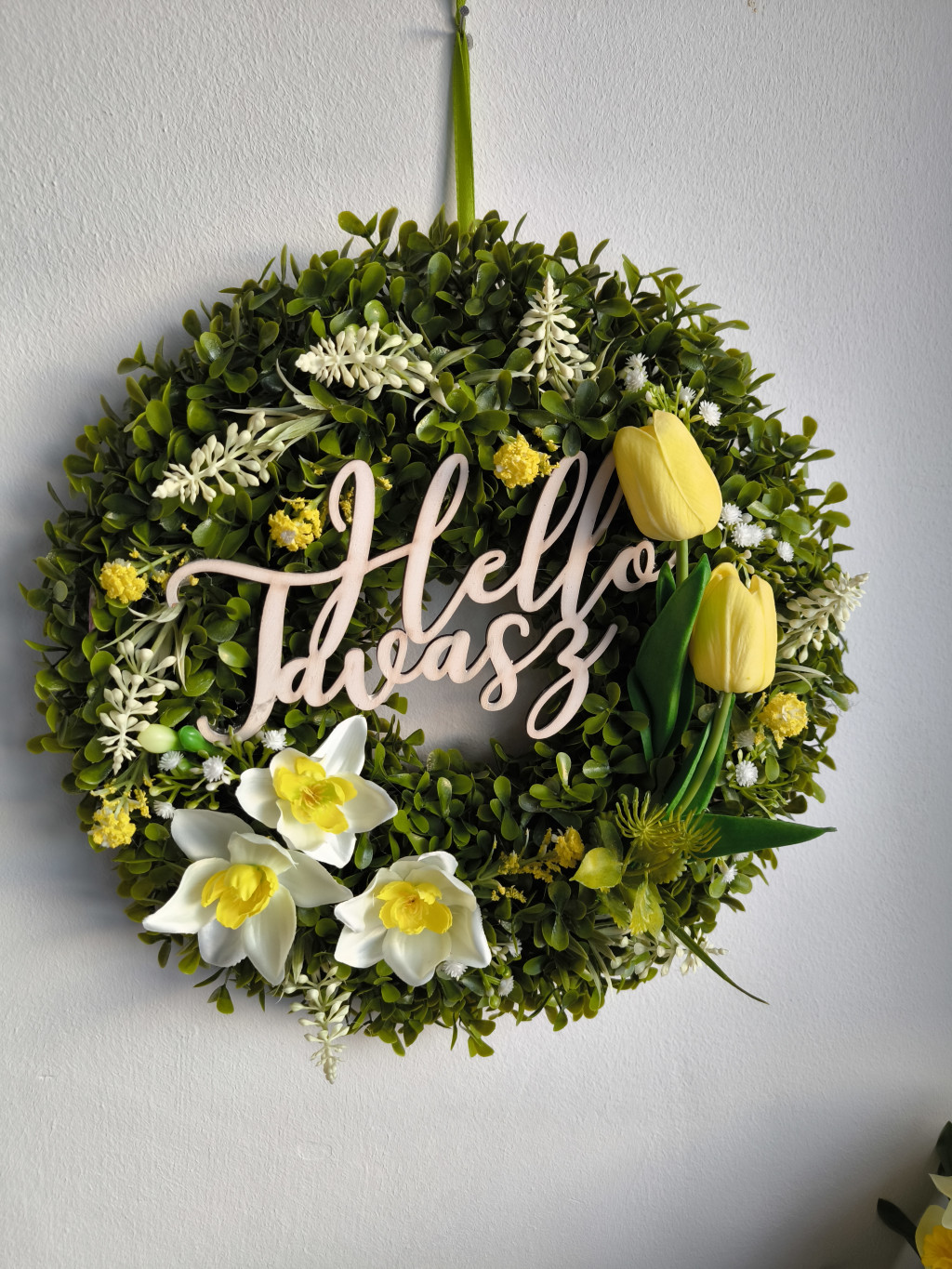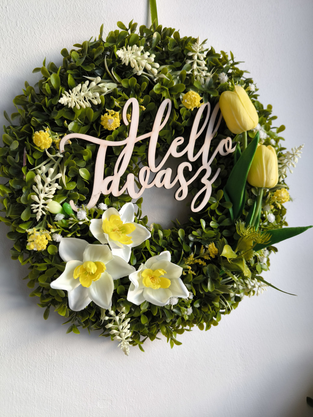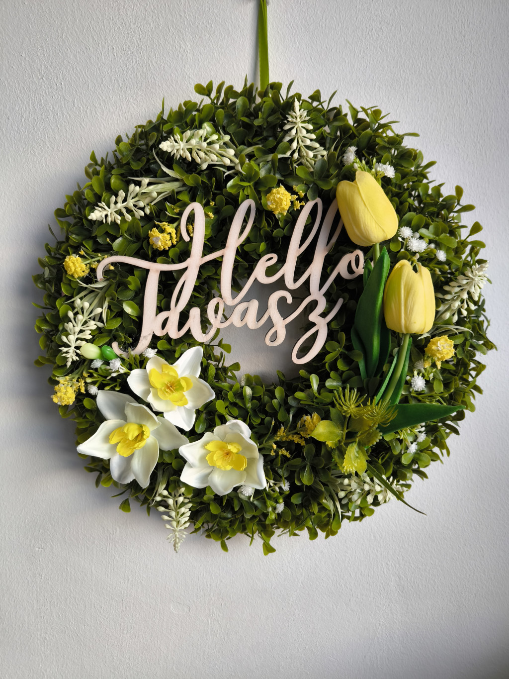 Napfényes Tavasz ajtódísz a tavasz első meleg sugarait hozza el otthonodba. A friss zöld lombok közül kibontakozó sárga tulipánok és finom fehér virágok a megújulás, a remény és az új kezdetek üzenetét hordozzák.