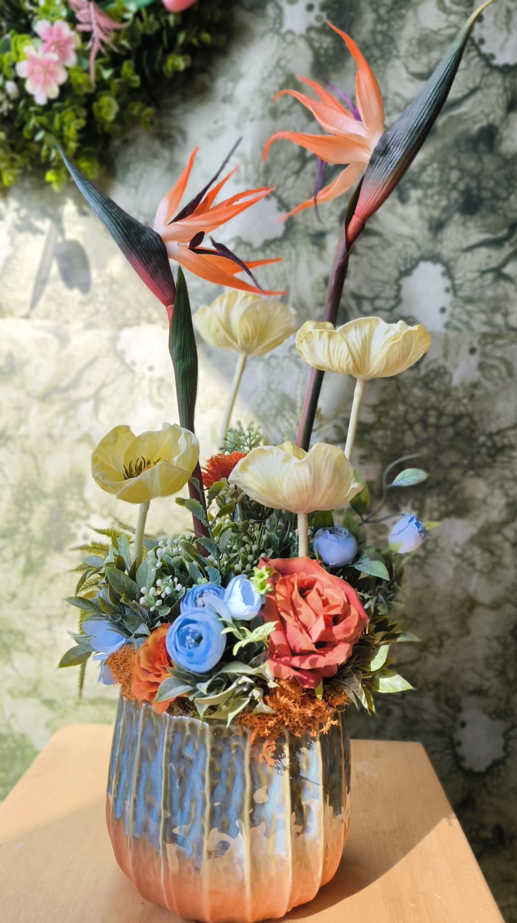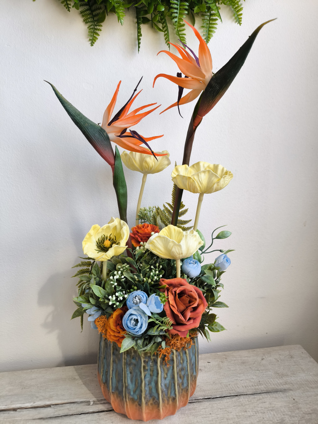 A narancs árnyalatú virágok mellett finom krémszínű virágok, lágy kék és meleg narancs tónusú rózsák, valamint természetközeli zöldek alkotnak harmonikus egységet. A kompozíció egy különleges, rusztikus mázas kaspóban kapott helyet, amely szépen kiemeli a virágok színeit.