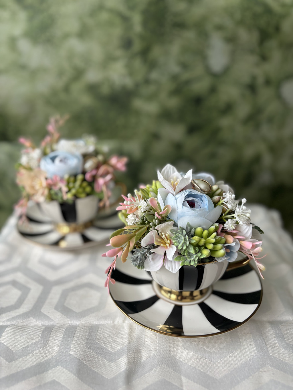 A Teaidő az udvarban asztaldísz a Regency-kor elegáns teadélutánjainak hangulatát idézi: kifinomult részletek, romantikus színek és játékos báj találkozása.
